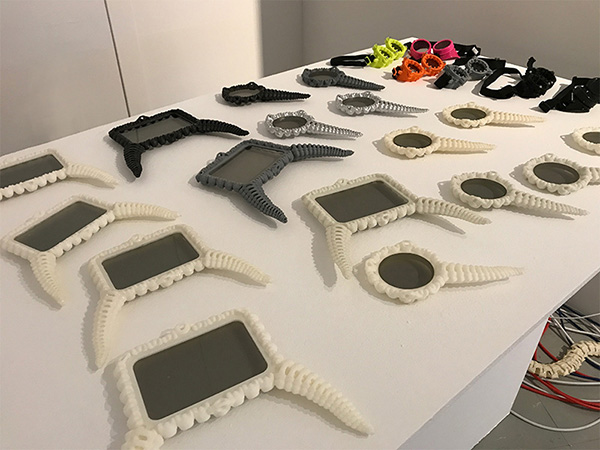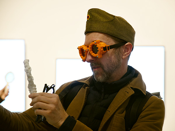 Des loupes organiques à la Cronenberg, des pads et lunettes munis de filtres polarisant permettent au public d'entrevoir cette spéculation de l'autre côté du miroir. |