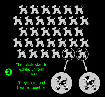 Suddenly these pathological symptoms start to appear and invade the whole pack. One animal, then two, then three… the whole pack seems touched by this epidemic. The animal shake, stumble, fall down, get up painfully. Then the pack of clones starts to exhibit an uniform and synchronous behaviour: all the robots start to shake and bleat all together at the same time. They can't stand up any more on their feverish paws. The mad cow disease seems to be here! |