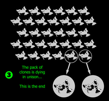 The tremors become more and more intense, then suddenly, they all fall down at the same time. Once lying on the floor, they groan with quavering bleats which seem to be insignificant when they are alone, but when we hear the 30 cries of the dying clones, they become frightening. This is the end… The clones become clones again. The pack is dying in unison. |