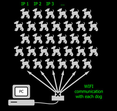To coordinate and synchronize the movements of the different robots it is necessary to be able to communicate with them in real time, and this in a reliable and fast way. Thus a smd wifi device has been developed and integrated to the robots. Each robot have now its own IP address and a central PC can communicate with each of them. The data are managed by the PC in a